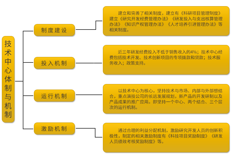 按照質(zhì)量體系要求,建立和完善了相關(guān)制度,技術(shù)中心的研發(fā)工作、管理工作納入了科學(xué)化、規(guī)范化、制度化的管理體系,實(shí)現(xiàn)技術(shù)中心的正常運(yùn)行。通過(guò)各項(xiàng)制度的實(shí)施,極大地調(diào)動(dòng)了廣大科技人員的積極性和創(chuàng)造性,推動(dòng)了公司的技術(shù)創(chuàng)新工作。已建立的制定有:《科研項(xiàng)目管理制度》、《研究開(kāi)發(fā)經(jīng)費(fèi)管理辦法》、《研發(fā)人員績(jī)效考核獎(jiǎng)勵(lì)制度》、《研發(fā)投入與支出核算管理辦法》、《技術(shù)評(píng)審委員會(huì)組成及職責(zé)》、《科技項(xiàng)目獎(jiǎng)勵(lì)制度》、《知識(shí)產(chǎn)權(quán)管理辦法》、《人才培養(yǎng)引進(jìn)管理辦法》等。